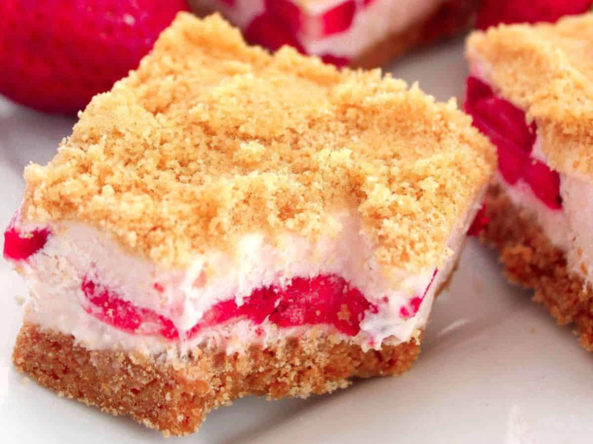 These bars take the best parts of strawberry shortcake and turn them into something you can carry in your hand. Fresh berries, soft cake, and creamy layers come together in a sweet bite made for sunny weather. They feel light but taste rich, making them a great ending to your outdoor meal.