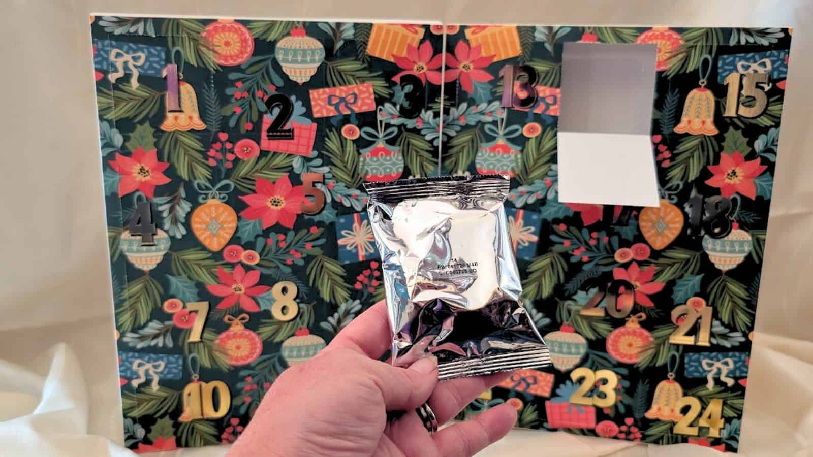 The silver bags are not labeled, so you can keep it as a surprise each day as you open them, if you choose. The back of the box has a sheet that discloses what each item is and the nutritional information if you are less adventurous – like me – and want to know ahead of time what you’re getting. The different snacks were tasty and definitely varied, so I never felt like I was getting the same thing again and again, especially in this season filled with sweets.