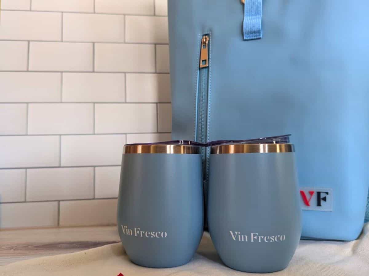 This backpack comes with two matching tumblers (and lids), and the removable divider keeps your wine bottles from bumping into each other and potentially getting damaged. It holds two bottles of wine, plus the tumblers, which is perfect for a night out.