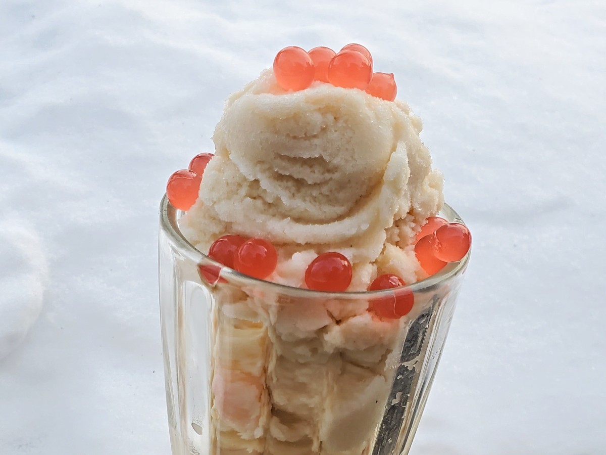 Glass with brown sugar snow cream sitting in snow and topped with boba.