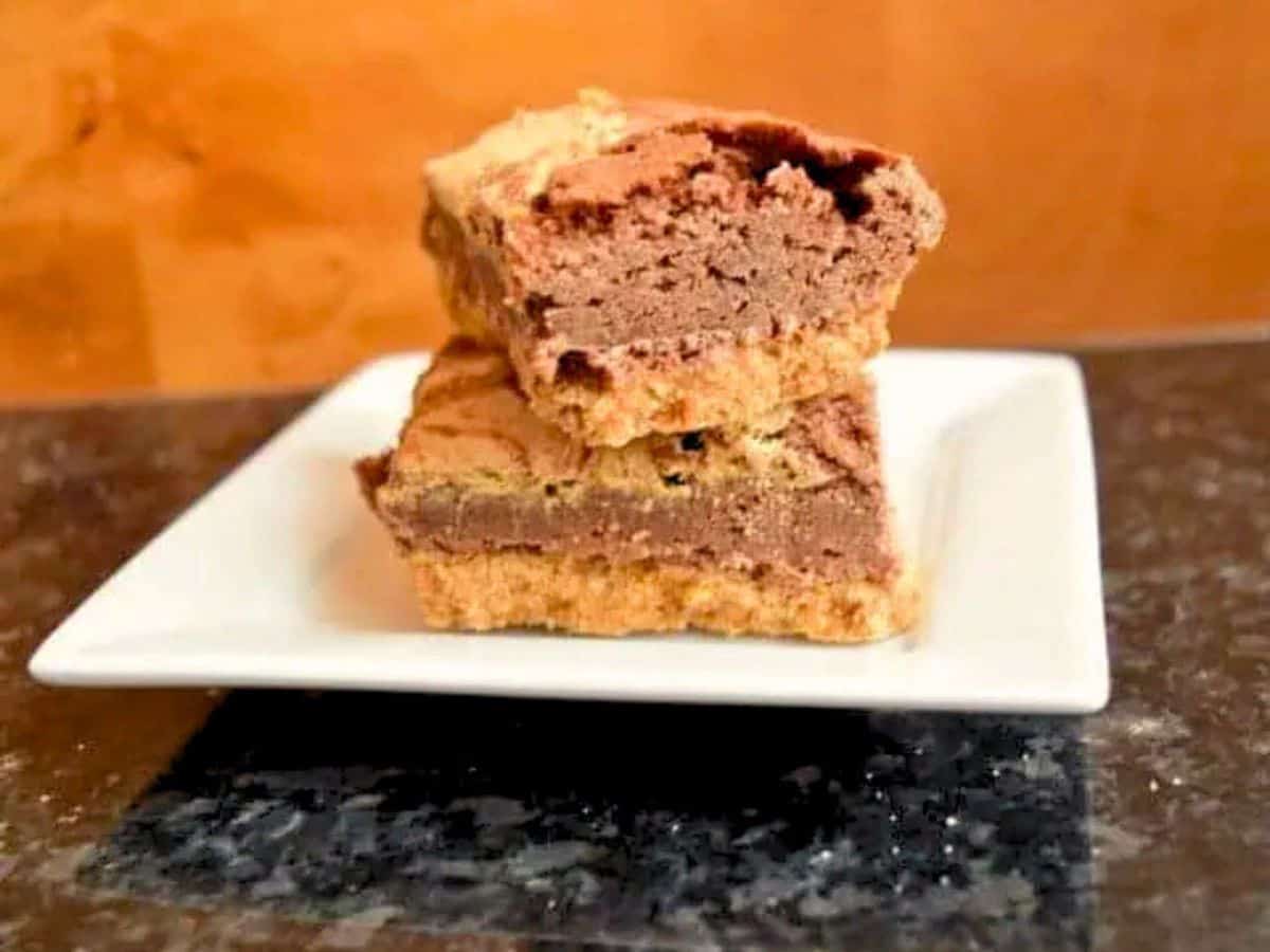 Image shows Two butterscotch brownies with melted chocolate filling on a white plate, close-up view.