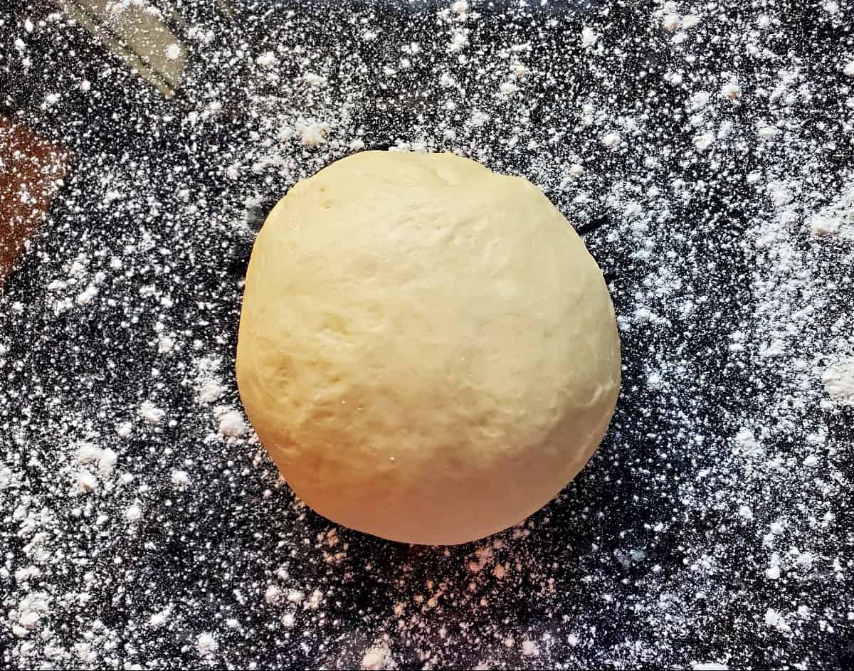 Once the crescent roll dough rises, lightly dust your rolling surface with flour. Ensure you start with as even and round of a ball of dough as you can.