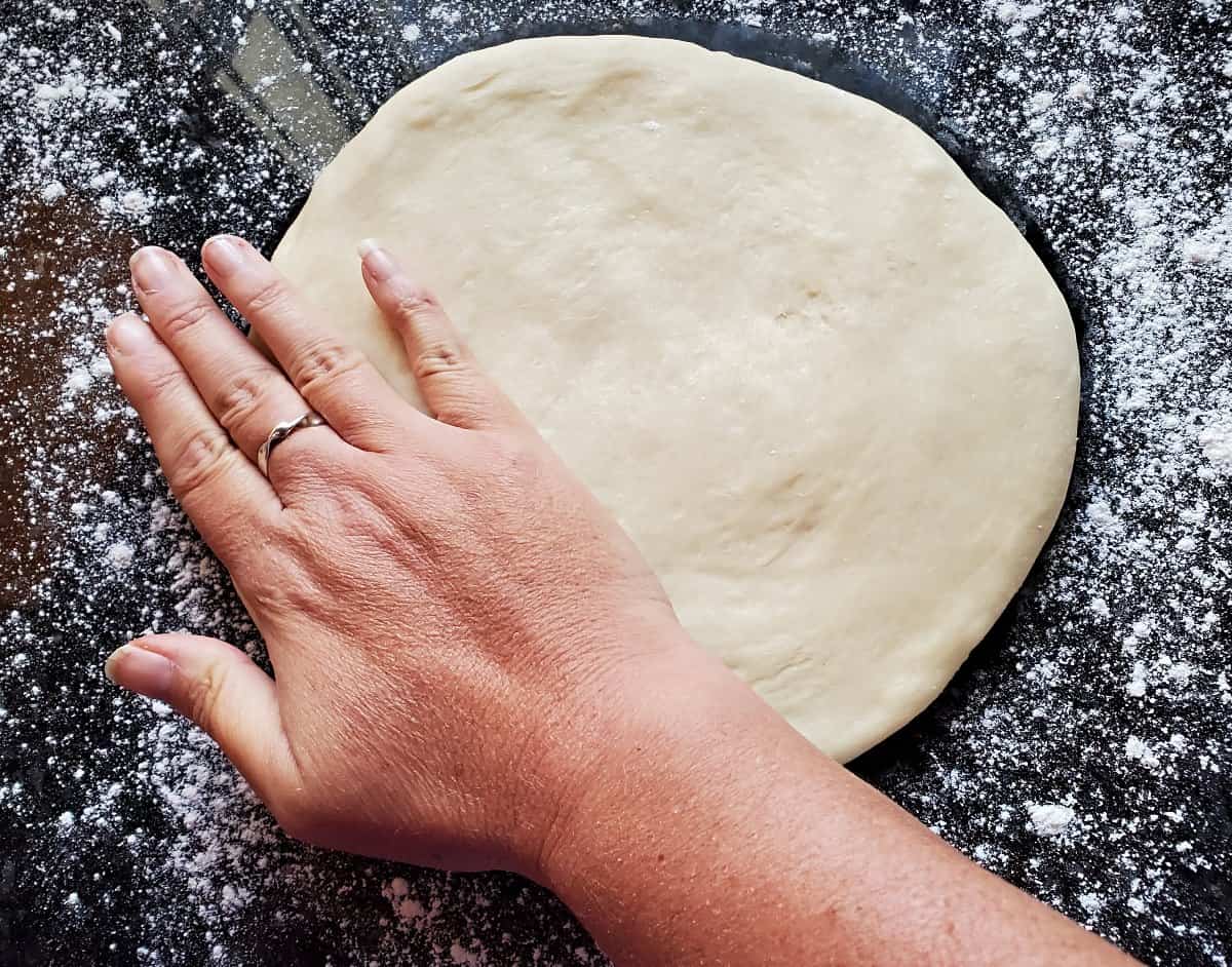 Press it out gently, using your clean hand. Do your best to keep it in an even circle, then use a rolling pin to finish the job.