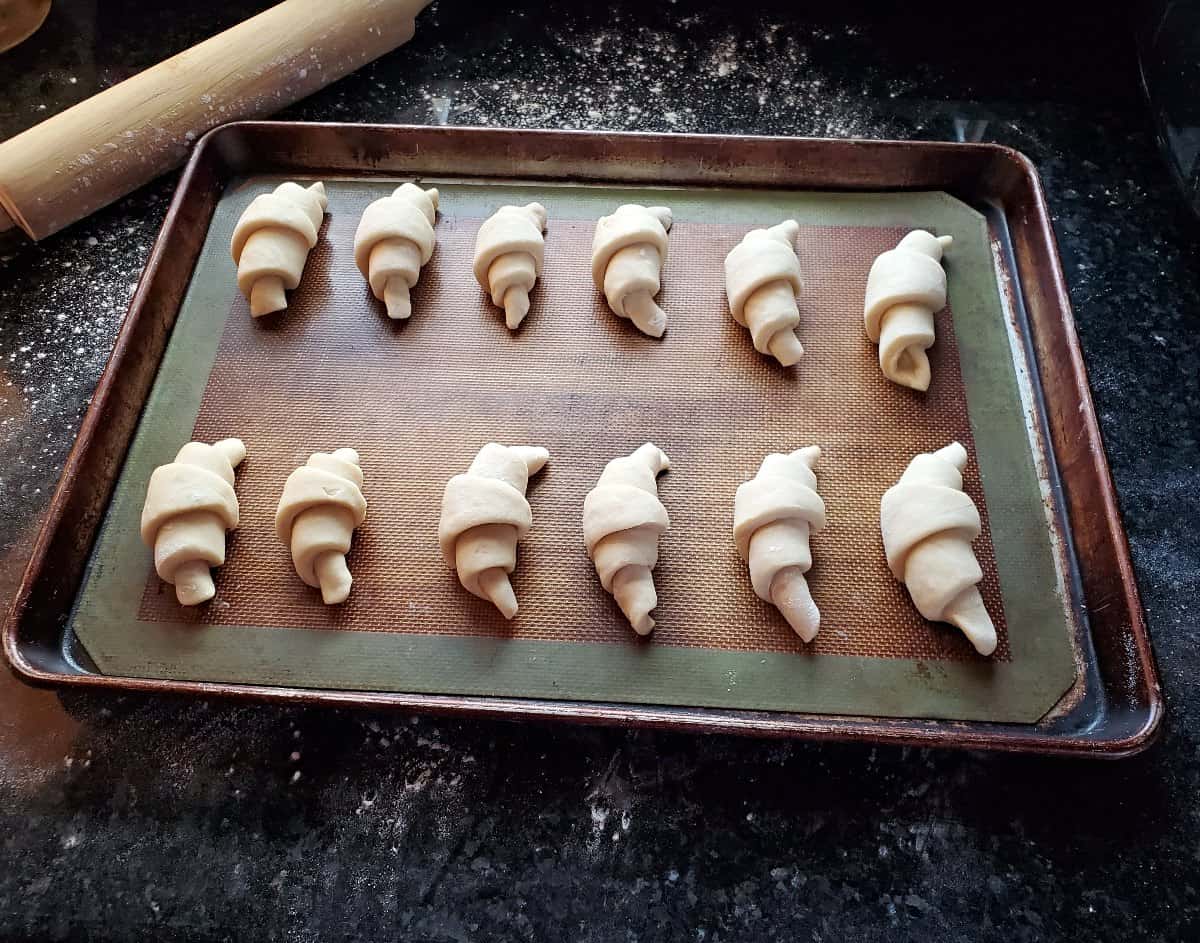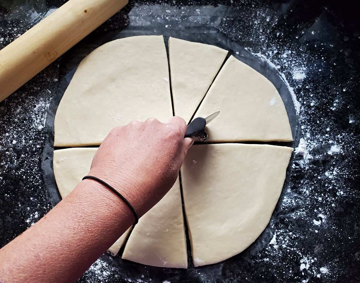 - Use a pizza cutter to slice into 12 triangles. Roll each wedge into a crescent, place on the baking sheet with the point facing down.