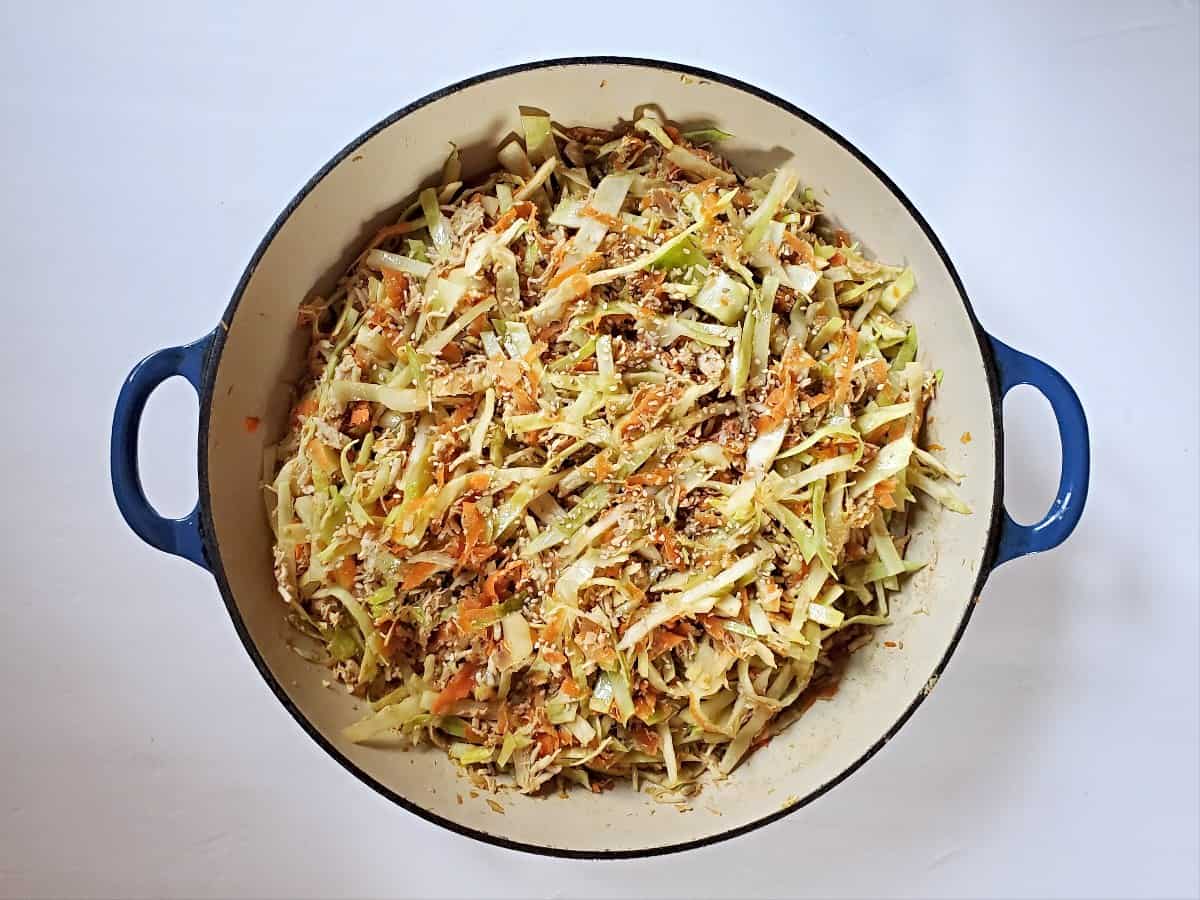 Cook this mixture for another 5-7 minutes, stirring occasionally. You want to cook it until it’s all heated through and the shredded cabbage softens.