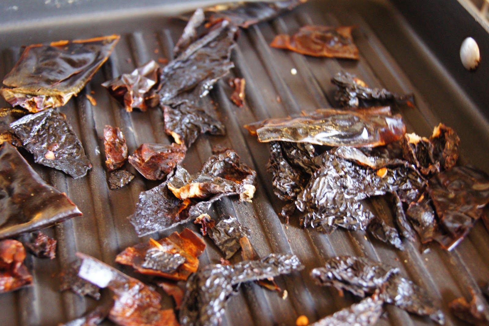 - Meanwhile, dry toast the chiles on a cast iron grill (or in a saute pan with a little grapeseed oil) on medium heat. Turn them once after a minute and a half or so.