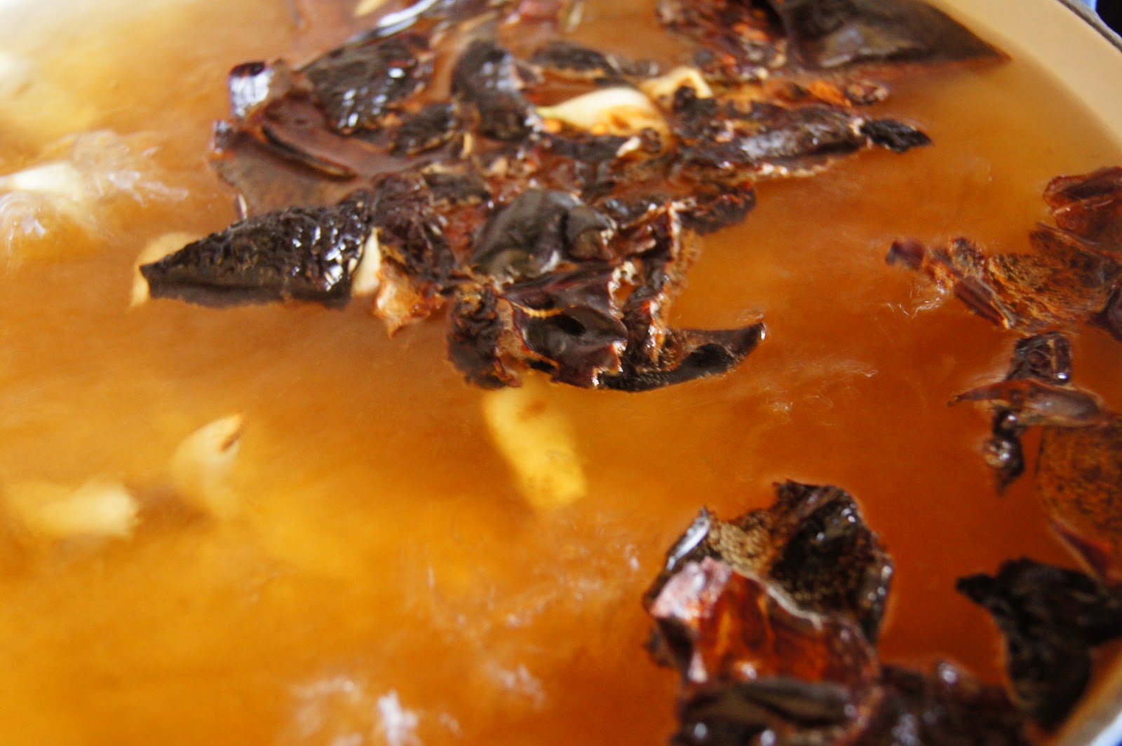 Toast the slice of bread and the tortilla in the grill pan until lightly browned. Add to the boiling water. (Do you see how much the water has changed color as the chiles are boiling in it? Cool, huh?)