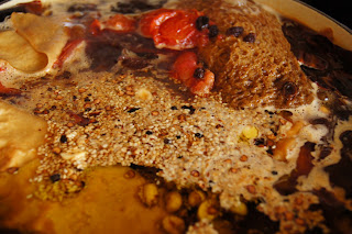 - Next up is the Mexican chocolate. You cannot just use "normal" chocolate for this. It has a different texture and taste, and it's perfect for this. I rough chop the chocolate, then add it, the grapeseed oil (or olive oil this time around), chicken stock, and salt to the pot of boiling water. At this point, you're probably going to start wondering if you did something wrong because it does not look pretty. You didn't.1/2 tablet Mexican chocolate, 1 cup grapeseed oil, 2 tablespoons chicken stock, 2 teaspoons salt