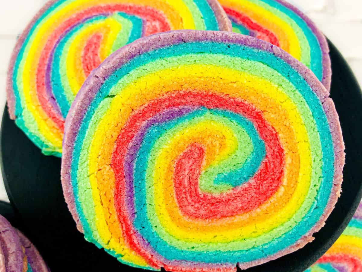 Image shows irresistible rainbow pinwheel sugar cookies.