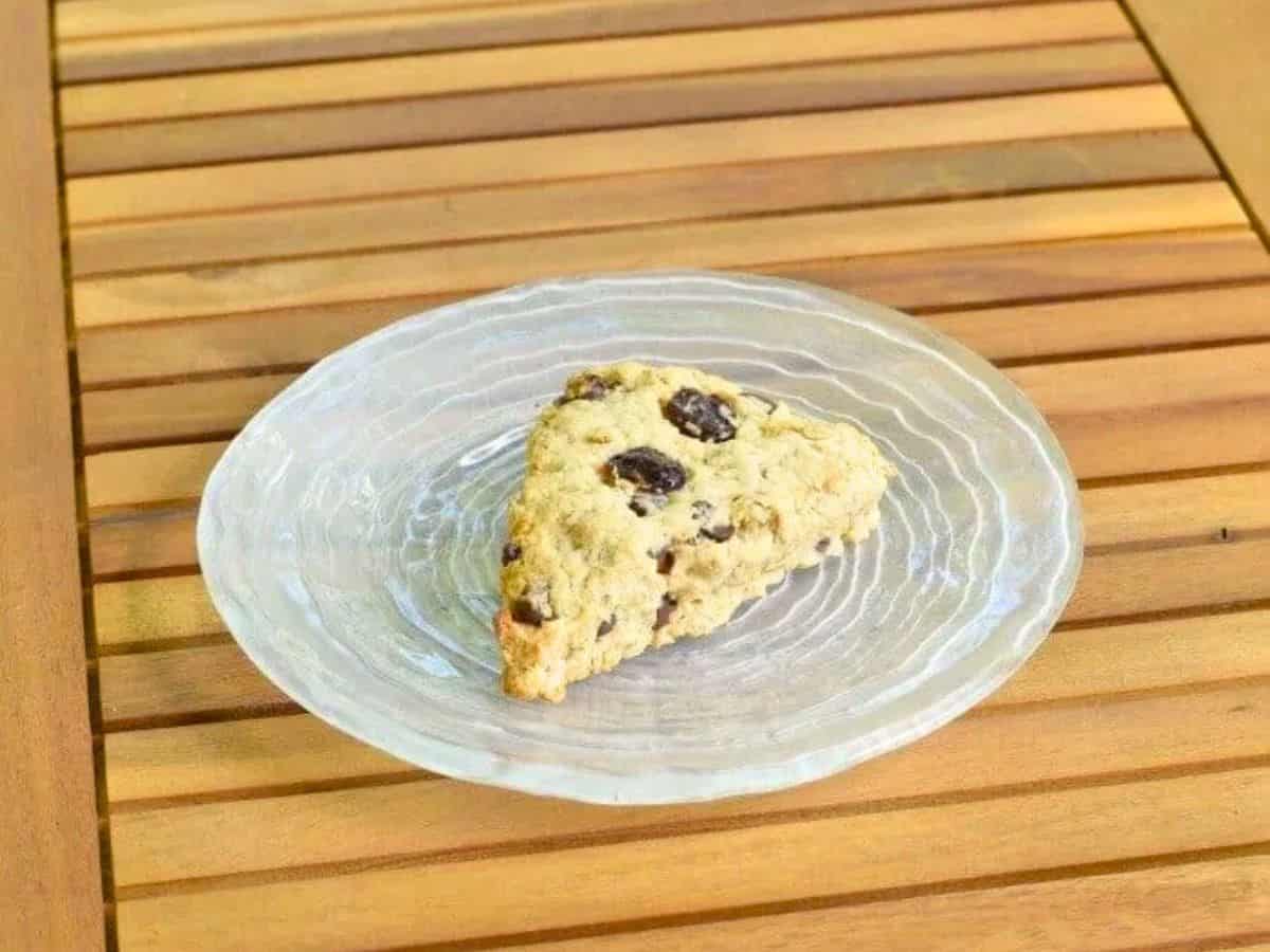 Image shows a Chai Scone on a white plate sitting on a wooden table.