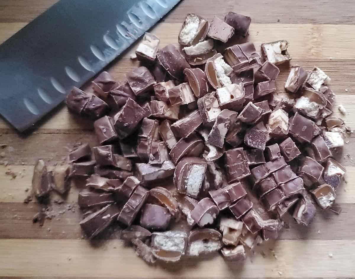 Chopped candy bars on a wooden cutting board with a knife.