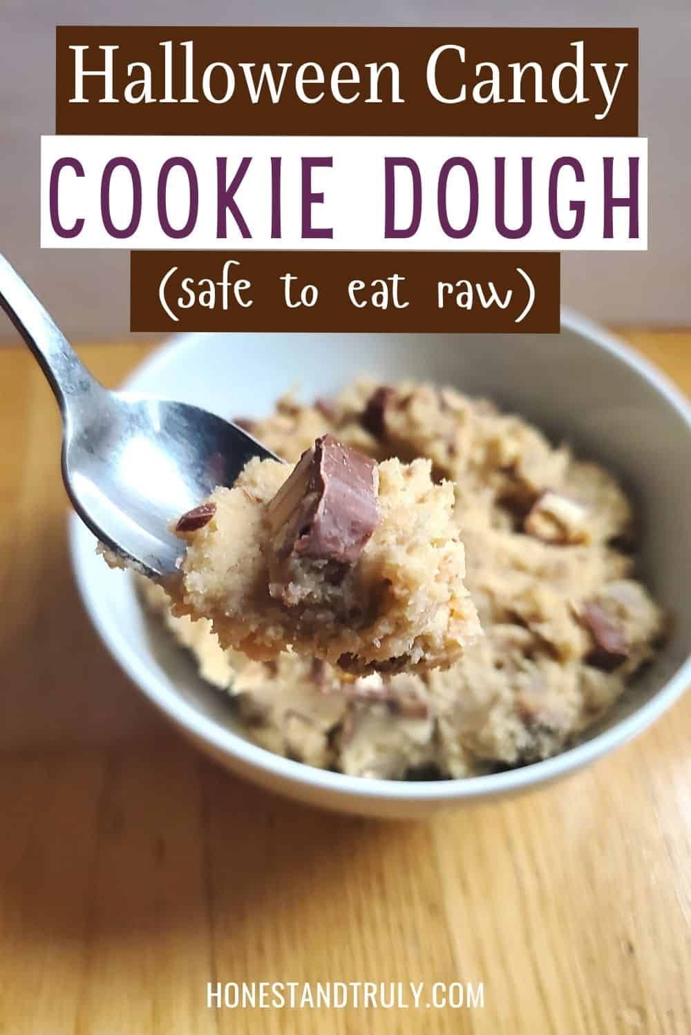 Closeup of a spoon of cookie dough with text Halloween candy cookie dough safe to eat raw.