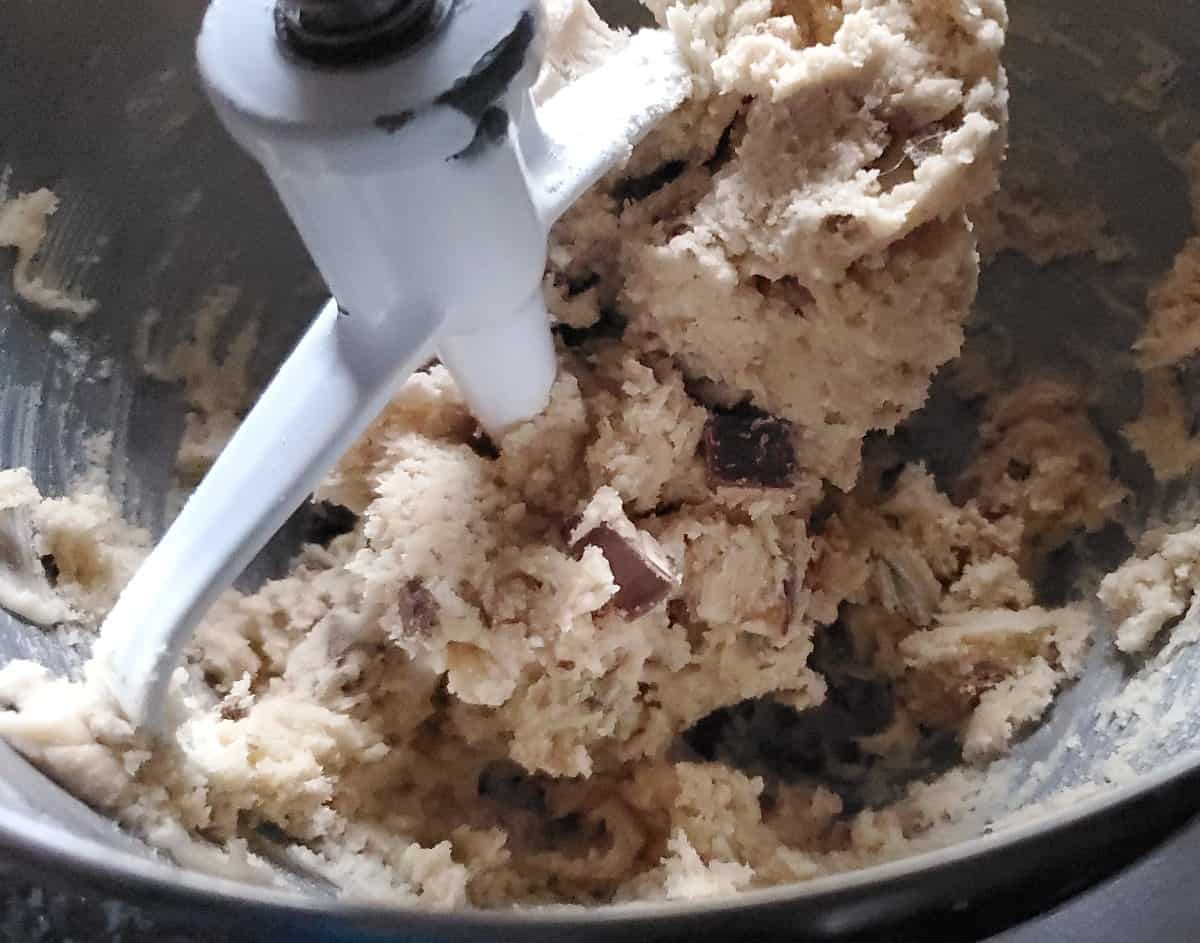Overhead shot of a mixing bowl with cookie dough.