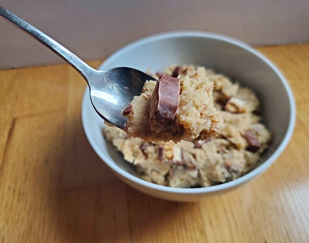 Overhead shot of edible candy bar cookie dough in a white bowl.