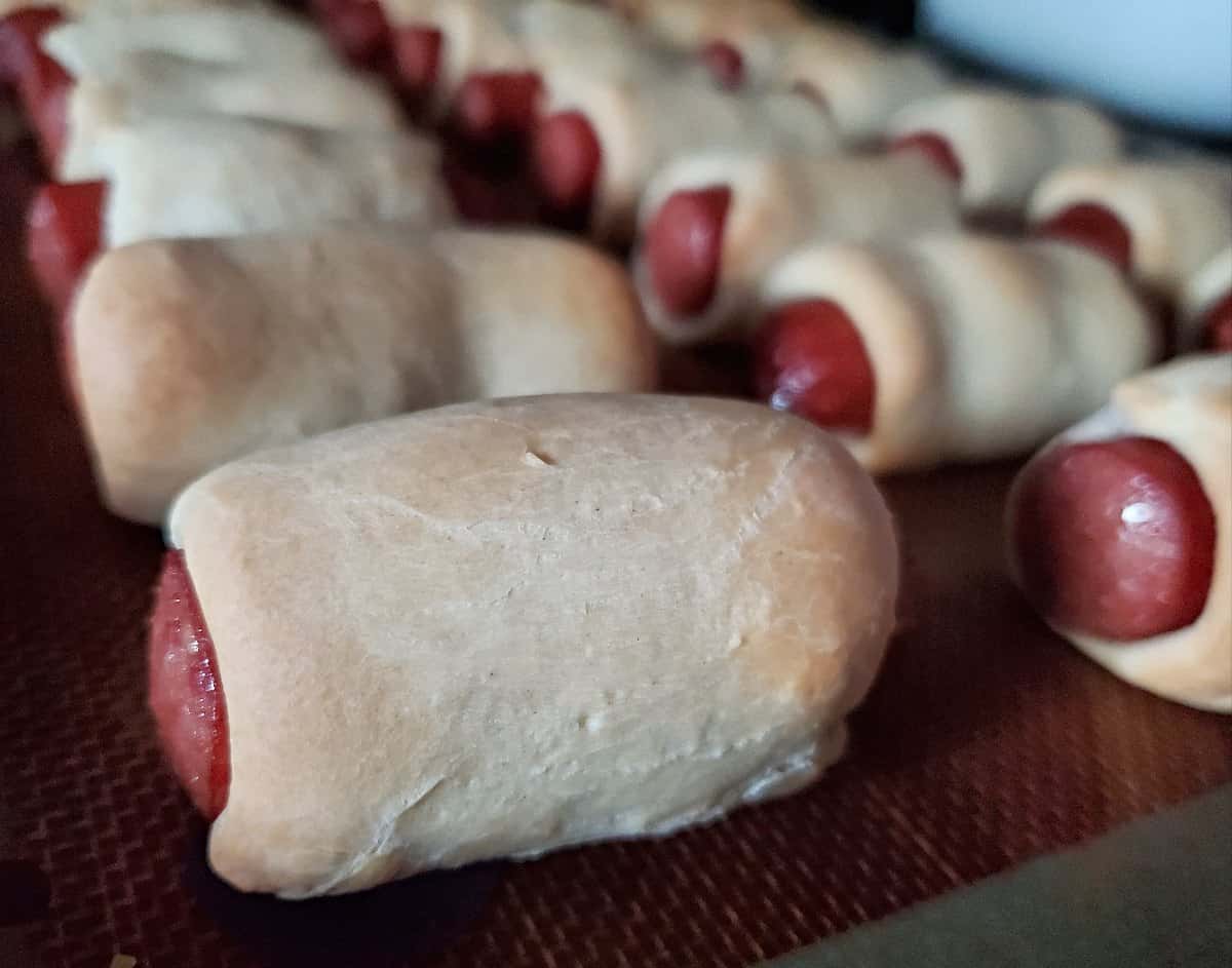 - Place on baking sheet, and repeat with remaining dough and hot dogs.