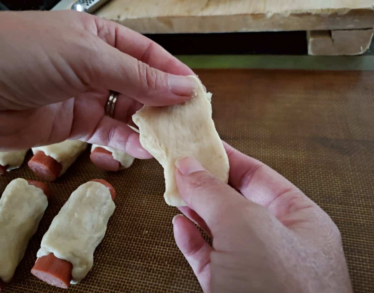 - Wrap dough around hot dog, seal, and smooth to the edges.