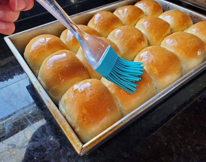 Melt your butter just before they come out of the oven, and use a pastry brush to brush the tops of your homemade yeast dinner rolls with it.