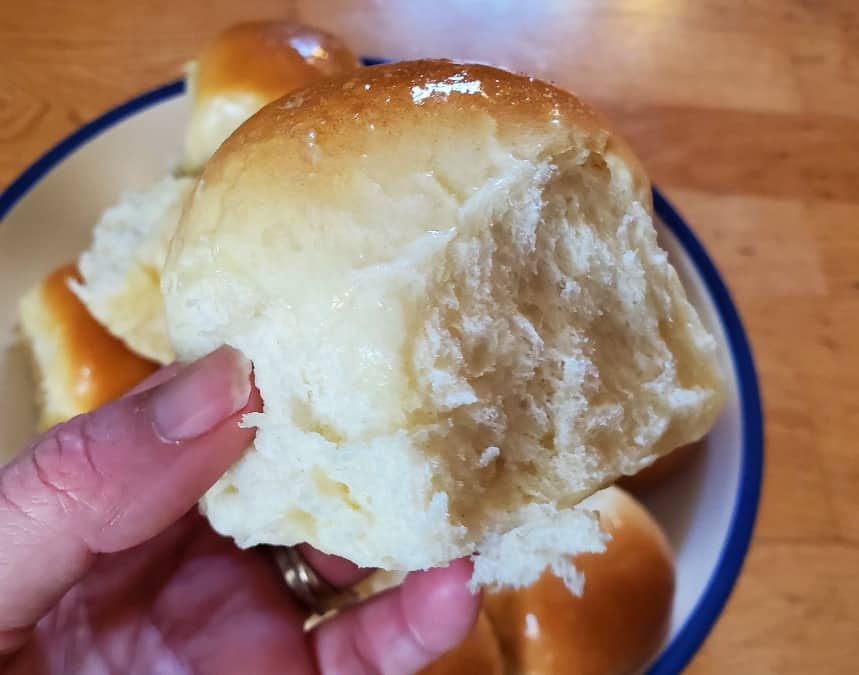 This recipe is wonderful! I can see my waist expanding as I type. Follow the directions and make sure you knead the dough long enough. I used my stand mixer and used the dough hook for eight minutes. After they rose, I made a bit of a log roll then used dental floss to get a clean cut. I weighed each roll so they were the same size. I got 15-1.4 ounce rolls. They won’t last long around her. Mine came out a golden brown on top and the perfect color on the bottom. And the insides were lighter than air with all their little air pockets. Try them…you won’t regret it!! Oh, I also found the tip to add your dry ingredients to the wet ingredients. That made a tremendous difference.
