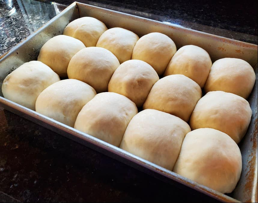 This recipe forms 15 rolls, which fit perfectly into a 9×13 pan. Grease your pan with nonstick spray lightly while your dough does its first rise.