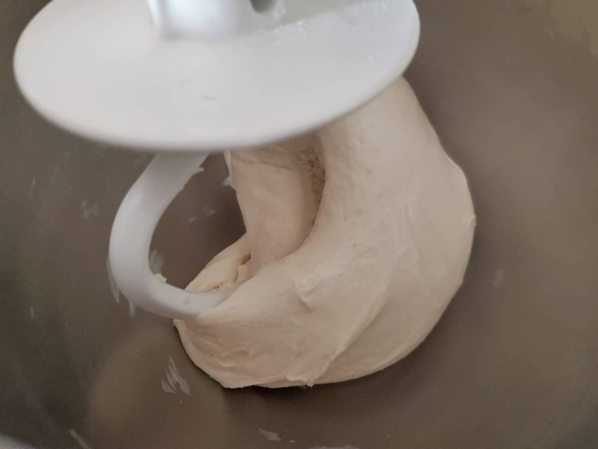 You want an elastic and smooth dough, though it should remain slightly sticky. Knead once the dough comes together for 5-7 minutes.