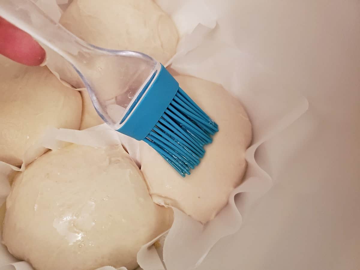 Brushing dough balls with egg wash using a blue pastry brush,