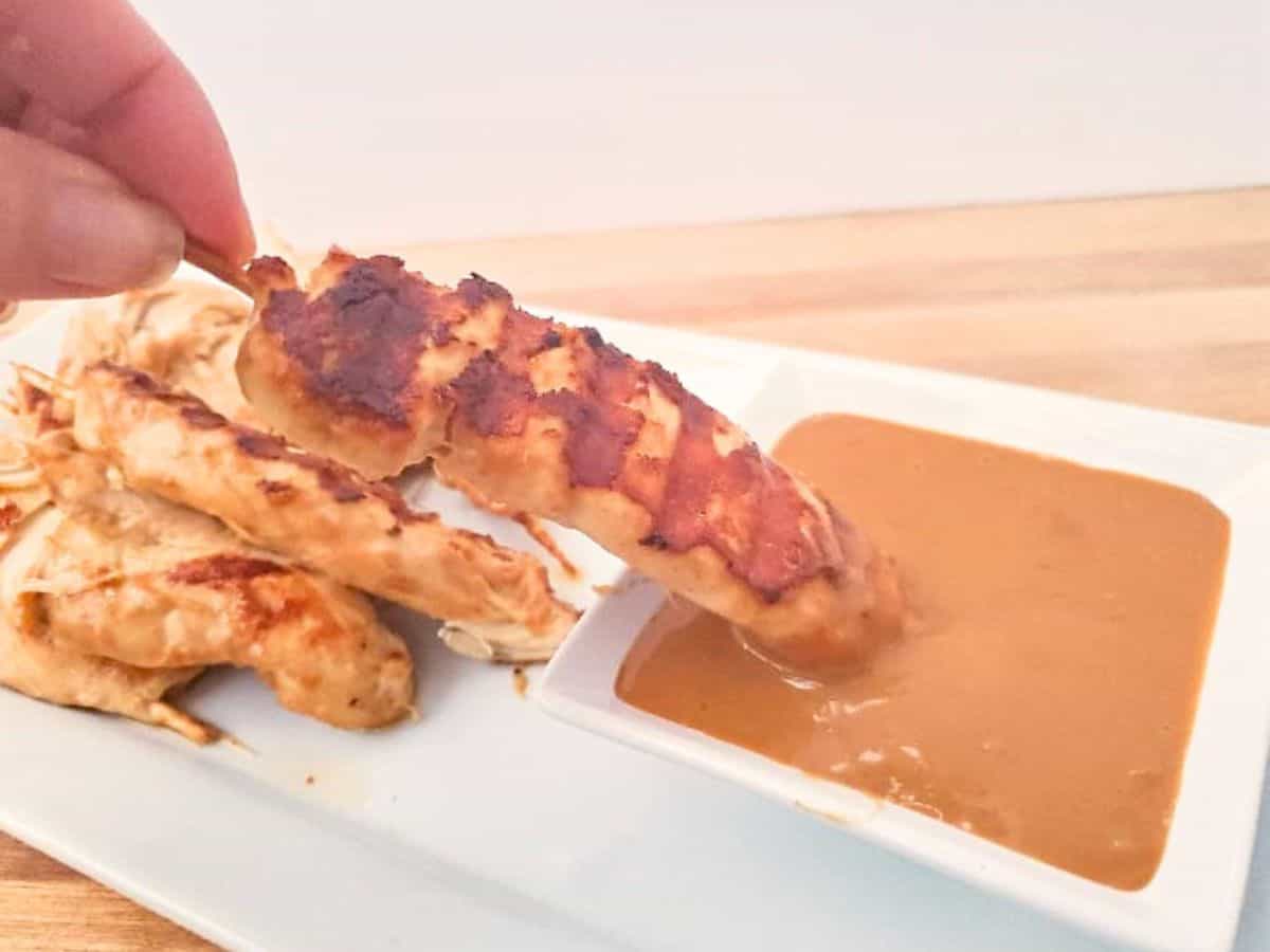 Image shows easy to make grilled chicken satay with peanut sauce.