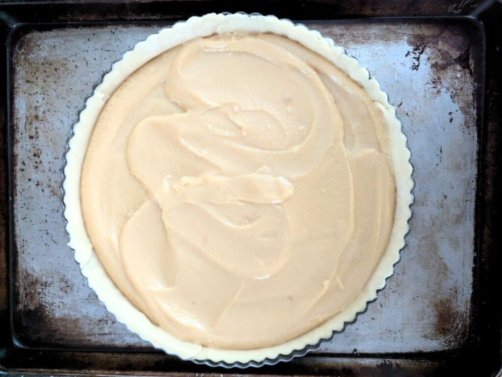 Remove from heat and cool slightly. Spread evenly over the crust, and let stand ten minutes until set. Preheat oven to 350 degrees.