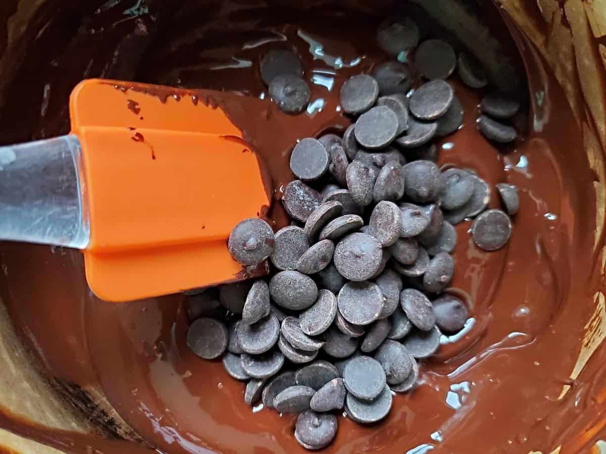 Once your chocolate is most of the way melted, turn off the heat and add the rest of the chocolate. Stir continuously until the chocolate fully melts.
