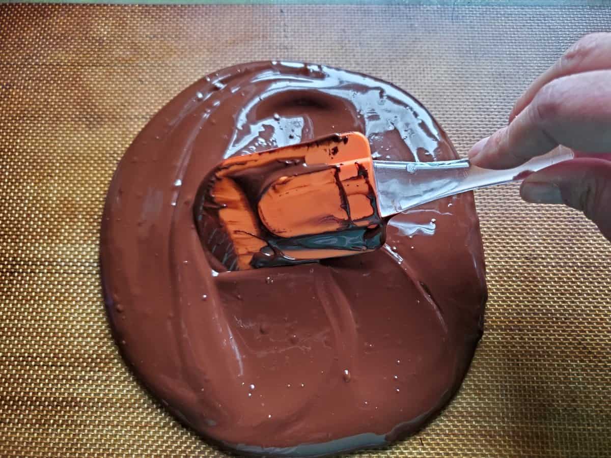 - Pour the melted chocolate mixture onto prepared baking sheet. Spread into 1/4 inch thick rectangle with a spatula.