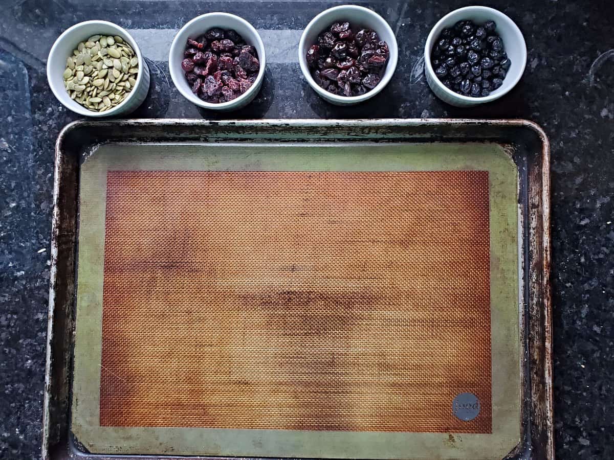I use dried cherries, dried cranberries, dried blueberries, and pepitas in this version, but you can swap out with your favorites. The big key is simply to make sure that they are bite size treats, as you don’t want to try to chew a whole dried banana slice or a big piece of strawberry, for example.