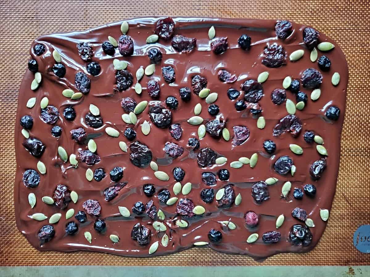 Sprinkle your dried fruit over the melted chocolate, then follow with the pepitas – or whatever toppings you chose.
