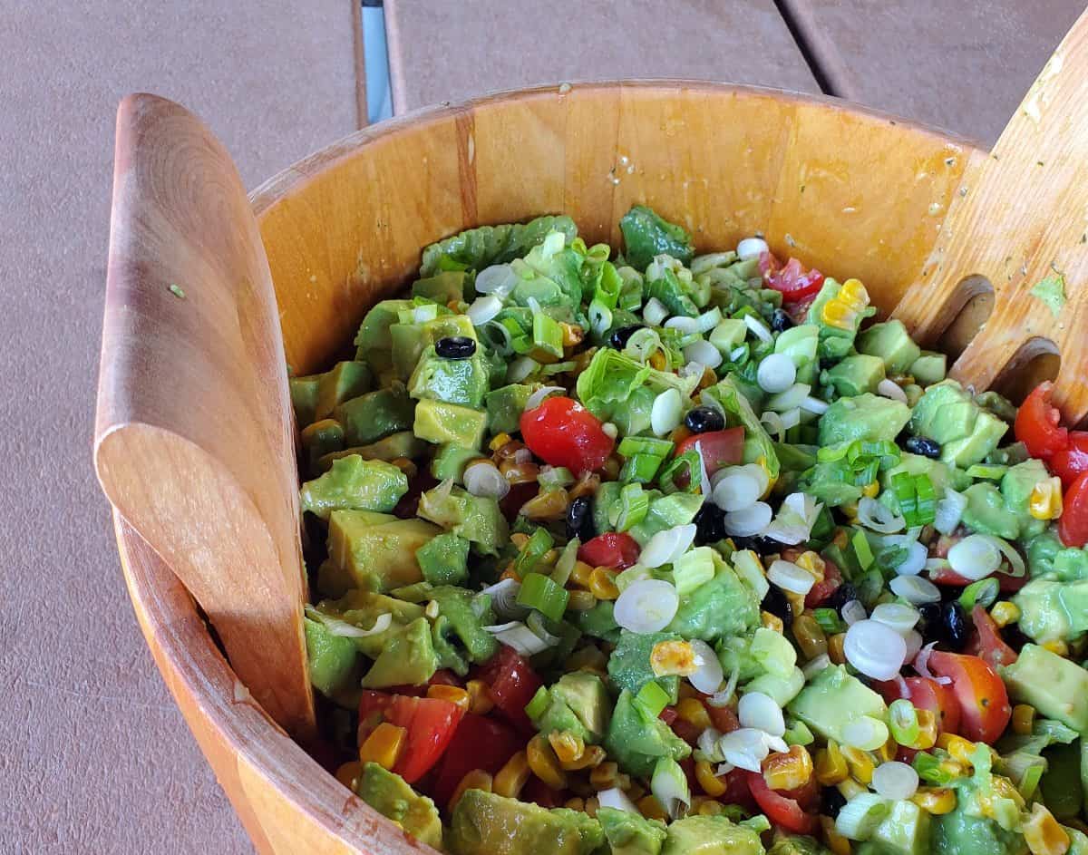 One word of warning: ensure you let the corn cool to room temperature before you add it to the avocado tomato salad. You don’t want to cook the other ingredients.