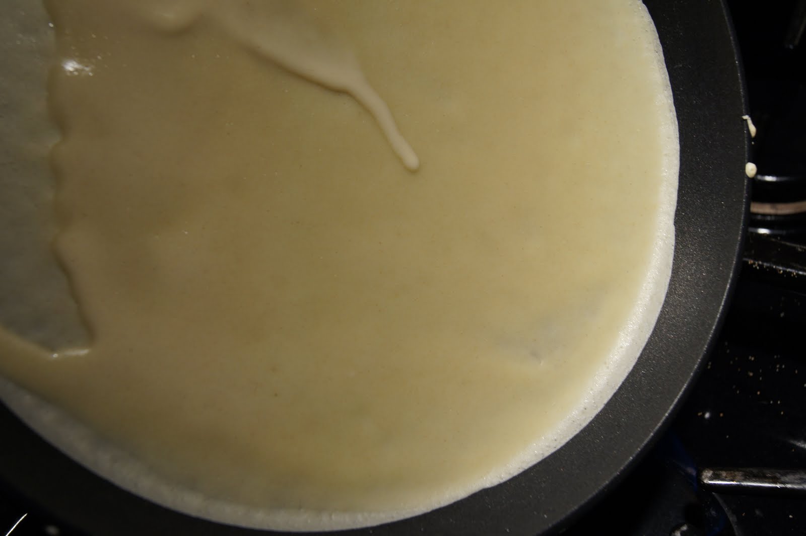 Immediately, you must pick up the pan and twirl it in a circle. Don’t do it slowly, or your batter will cook where it is an not spread across the entire pan.