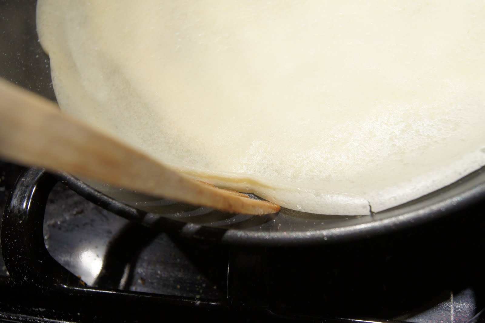 That doesn’t mean you have to toss the crepe, but your goal is to have it reach the full circle. It takes a little practice, but you’ll get it. Once you’ve twirled it and had the batter cover the entire pan, place it back on the stove and let it cook.