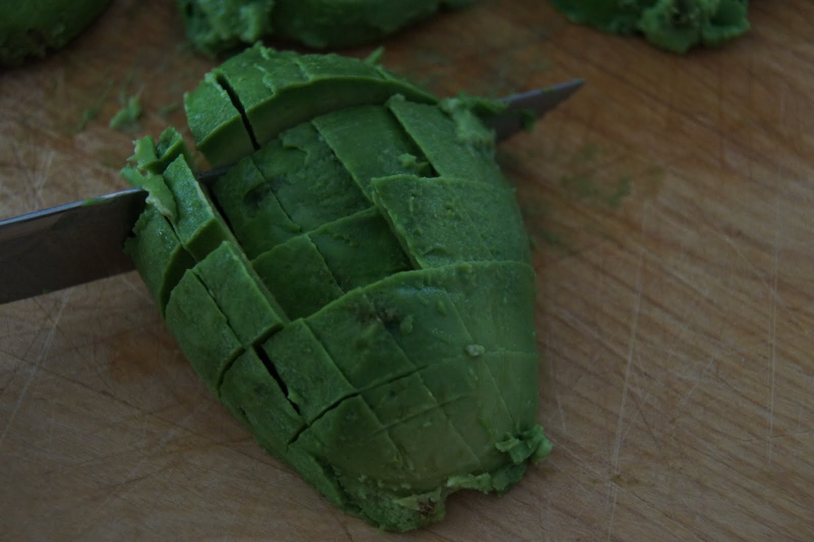Step 4: When you’re ready to cut your avocado, simply use your same knife again to run the knife lightly through the sections first one way and then another. The key here is to not cut them too small. Avocado is fairly delicate and will start to fall apart as you mix it, so you want to start with pieces larger than those you want to end with. For this reason, I never cut them to make them shorter and instead leave them the full height of the avocado – just 2 cuts, not three.