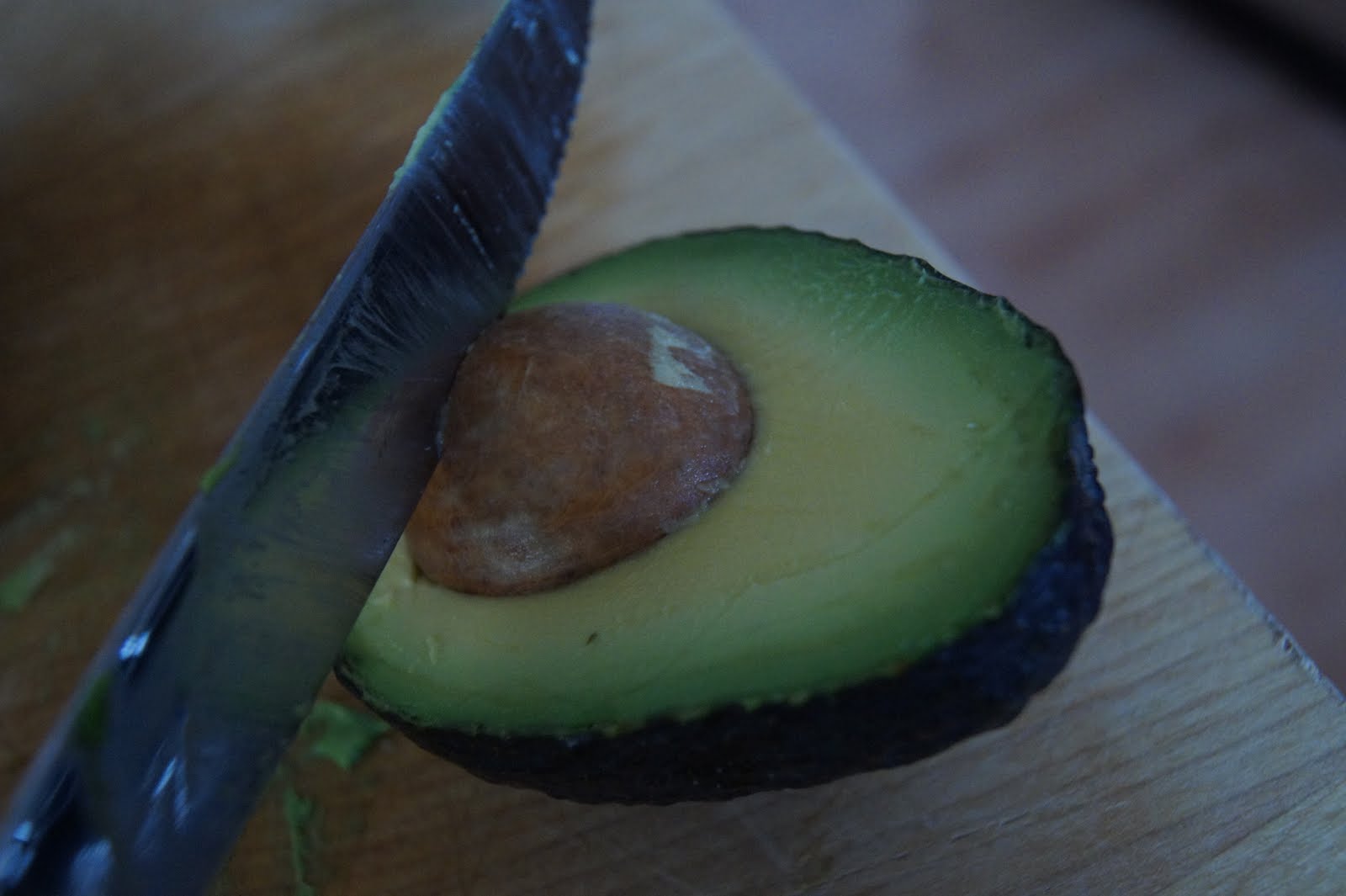 Step One: Cut the avocado in half lengthwise. This will give you the most room to maneuver. Once you’ve cut all the way around, twist the two halves in your hands and pull it apart. One half will be ready to go, and the other half will contain the pit.