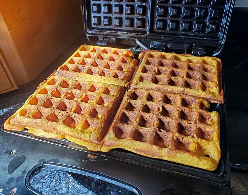 If it doesn’t (mine doesn’t), just know you’ll need to bake these longer than normal waffles. The pumpkin makes them take just a little longer to cook.